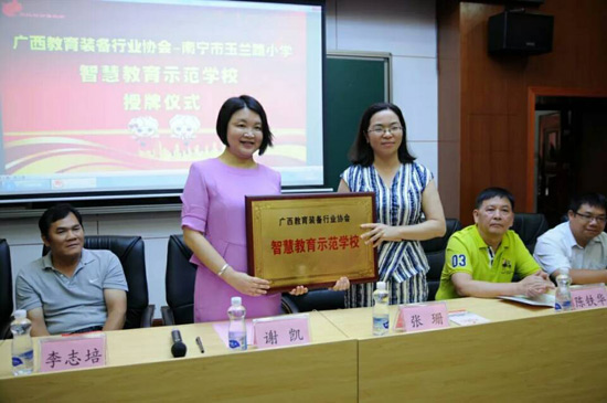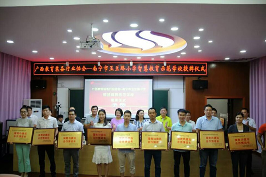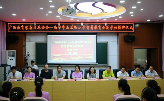 2018年6月27日上午,廣西教育裝備行業(yè)協(xié)會智慧教育示范學(xué)校掛牌儀式在南寧玉蘭路小學(xué)舉行,標志著南寧市玉蘭路小學(xué)新時代教育信息化發(fā)展駛?cè)肓丝燔嚨溃哂欣锍瘫街匾饬x。與會領(lǐng)導(dǎo)、全國教育裝備界的各知名企業(yè)代表、愛心人士、家長代表、教師代表,一同出席了活動,見證了這一歷史性的時刻。