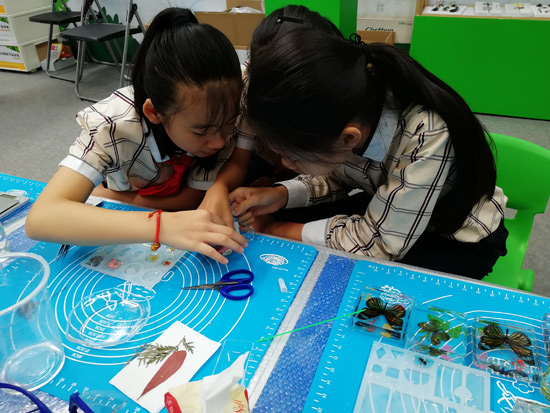 展會現(xiàn)場-工作人員給來訪人員介紹DIY學(xué)生實(shí)驗(yàn)制作解決方案產(chǎn)品及學(xué)生們展示DIY制作標(biāo)本