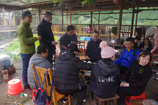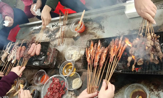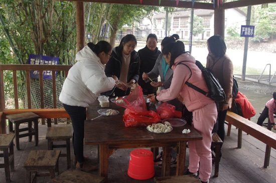 10:30分,我們正式抵達目的地“竹泉島山莊”,大家紛紛參與到午餐的準備活動中,生火、穿菜、刷油、配料、烤串……,大家紛紛施展各自拿手絕活,忙得不亦樂乎,不一會大家親手烤制的肉串就飄出陣陣誘人的香氣。太陽很應景在此刻從云層中鉆出,金色的光芒透過樹蔭照在每個朝氣蓬勃的笑臉上。